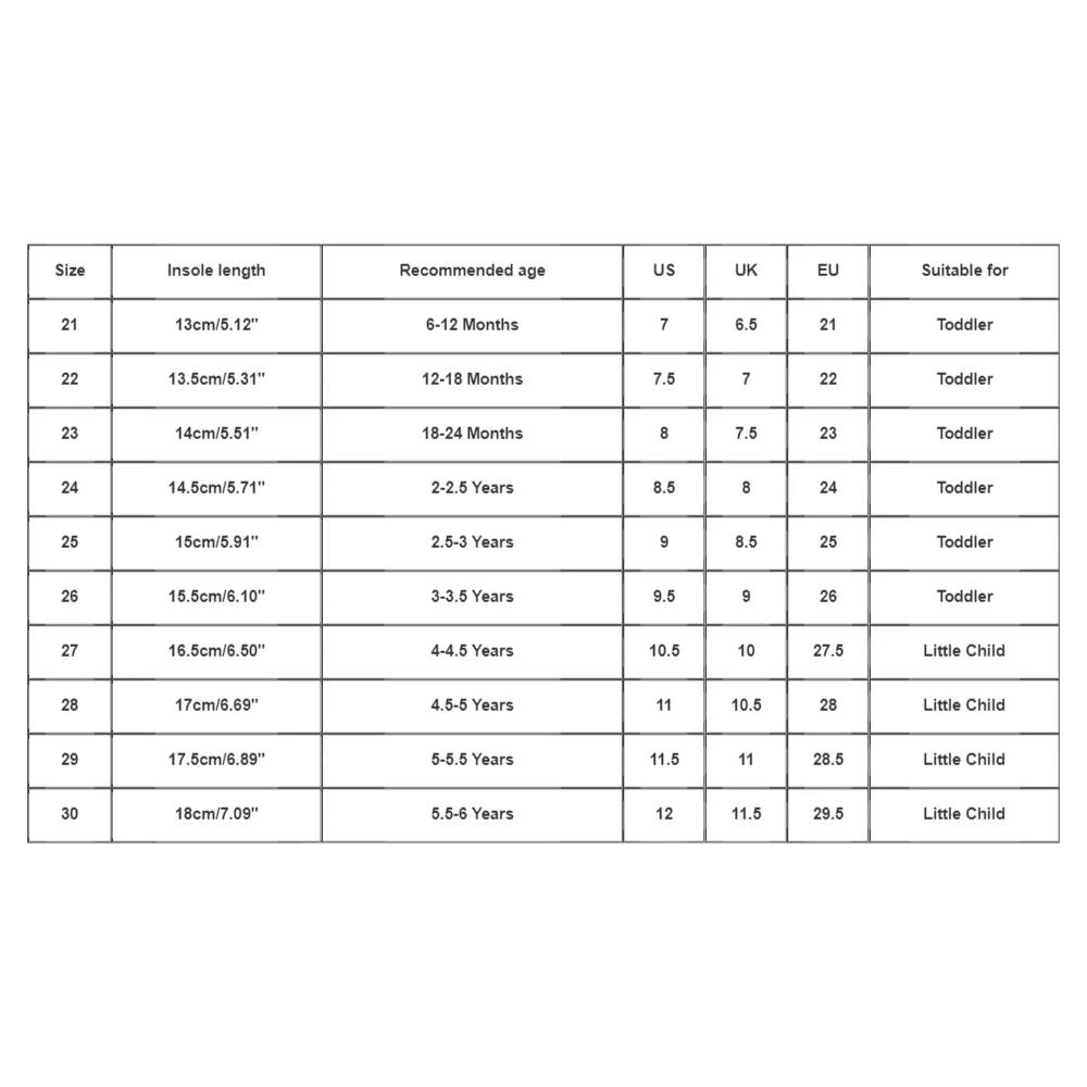 Size:22 Insole length:13.5cm/5.31” Recommended age:12-18 Months US :7.5 UK:7 EU:22 Suitable for:Toddler