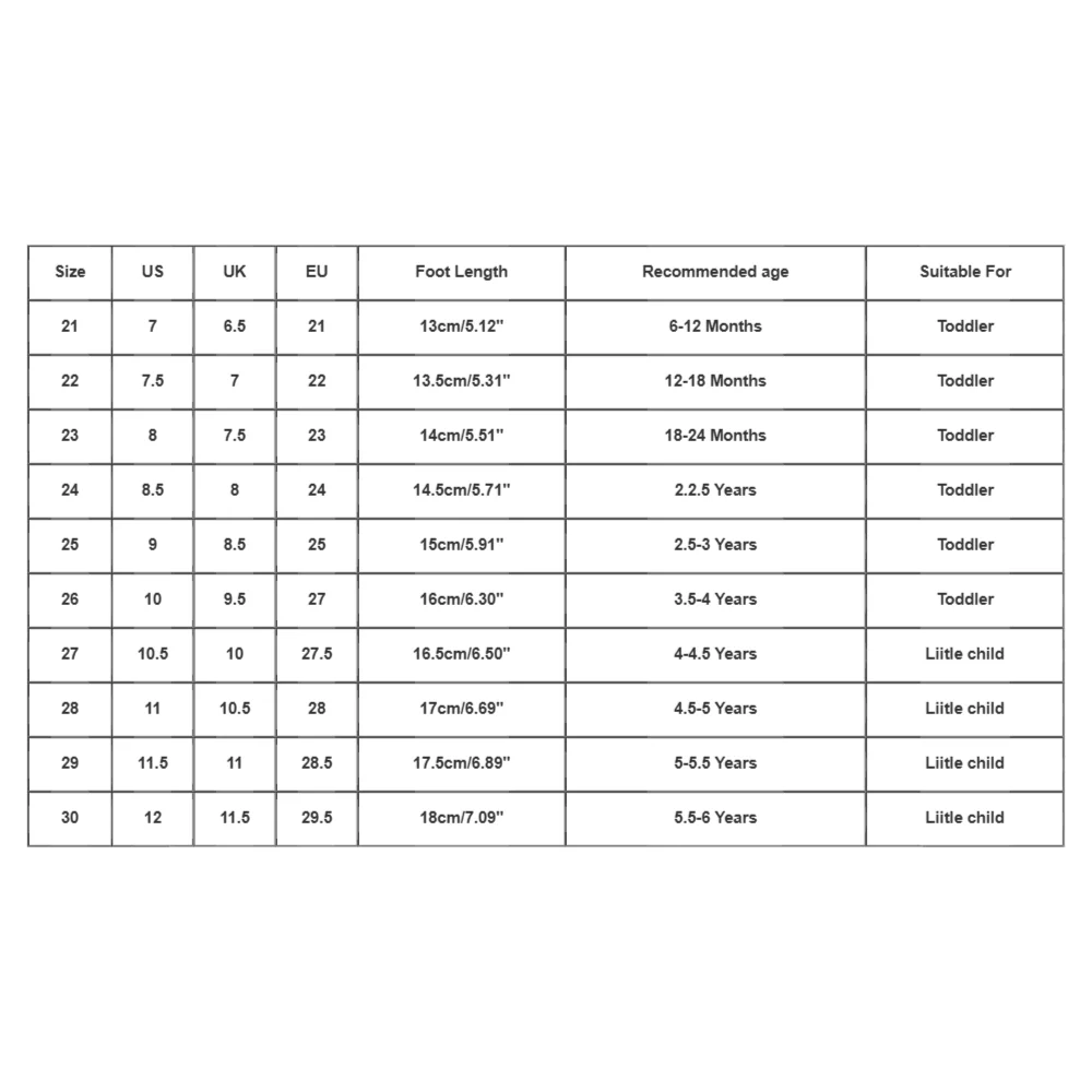 Size:21 | US:7 | UK:6.5 | EU:21 | Foot Length:13cm/5.12” | Recommended age:6-12 Months | Suitable For:Toddler |