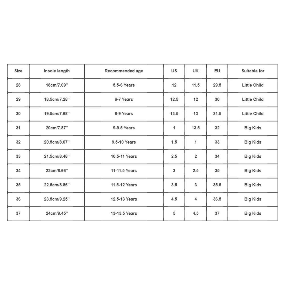 Size:31 | Insole length:20cm/7.87” | Recommended age:9-9.5 Years | US :1 | UK:13.5 | EU:32 | Suitable for:Big Kids |